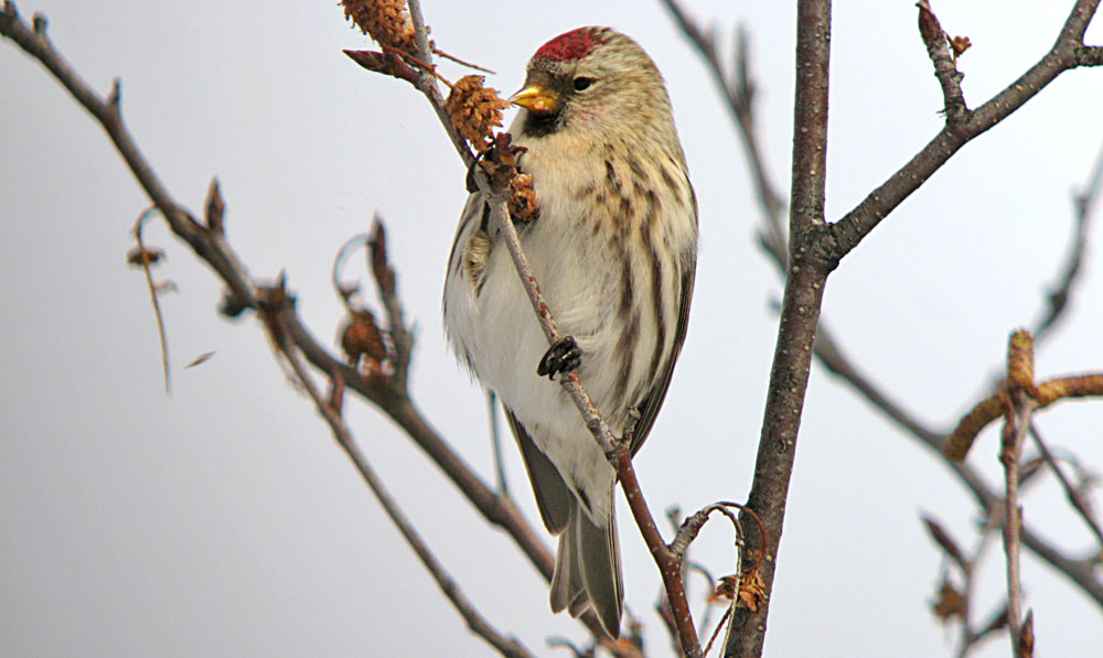 seem to survive entirely on tree buds. Pine Grosbeaks also visit