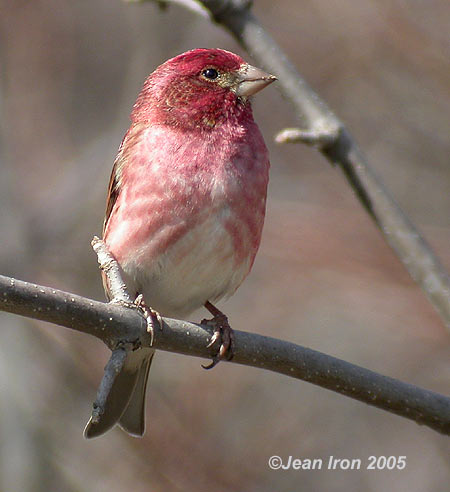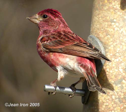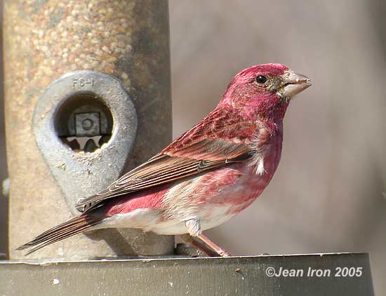 Scroll down for three photos. In April, Purple Finches have a rich raspberry coloured plumage, which becomes redder by the fall.