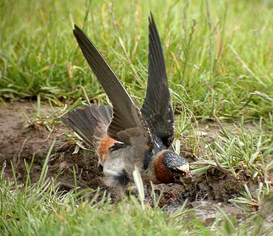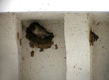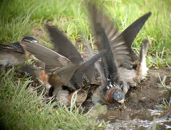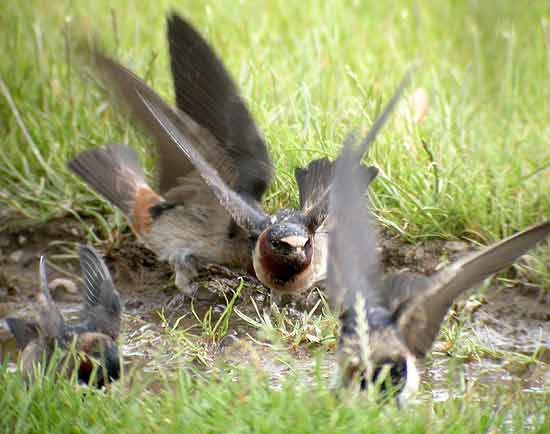 Cliff Swallows at Bronte Harbour frantically gather mud to rebuild nests that appear to have been destroyed on the lower east side of the yellow restaurant building. Photos 17 June 2005