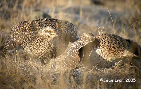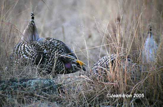 Two male Sharp-tailed Grouse face off at the lek on Manitoulin Island. Between 35 and 50 grouse were at the lek. We saw mostly males. |