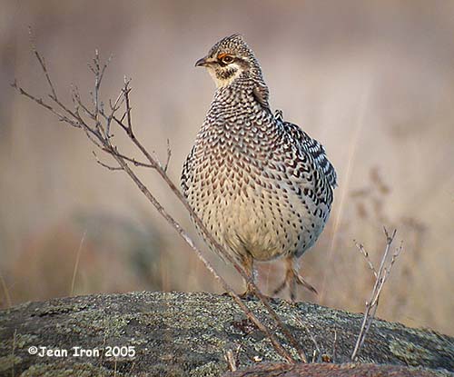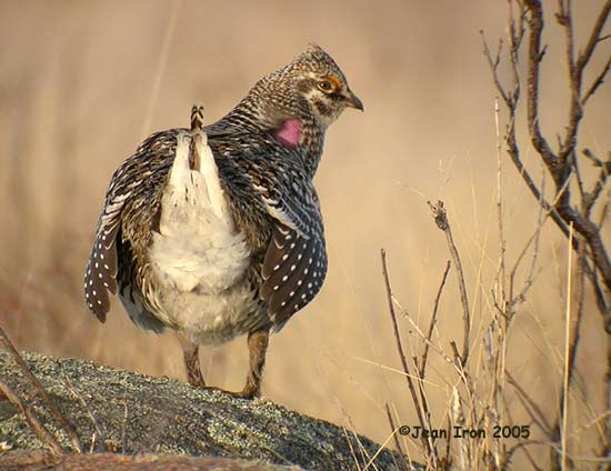 This male Sharp-tailed Grouse watches from a rock. It raises its golden eyebrows and makes cooing and cackling sounds with its purple air sacs. Males also rub their central tail feathers together to make a ratting sound like a lawn mower. |