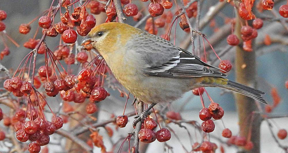 Female Pine Grosbeak on crabapples. Photo by Jean Iron. |