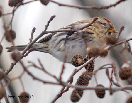 Redpolls plus a Pine Siskin fed on alder and birch seeds. |
