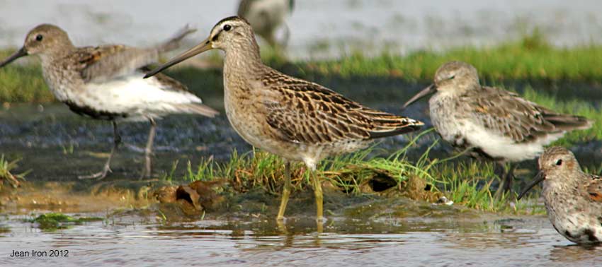 Dowitcher with molting adult Dunlin at Longridge Point on James Bay,