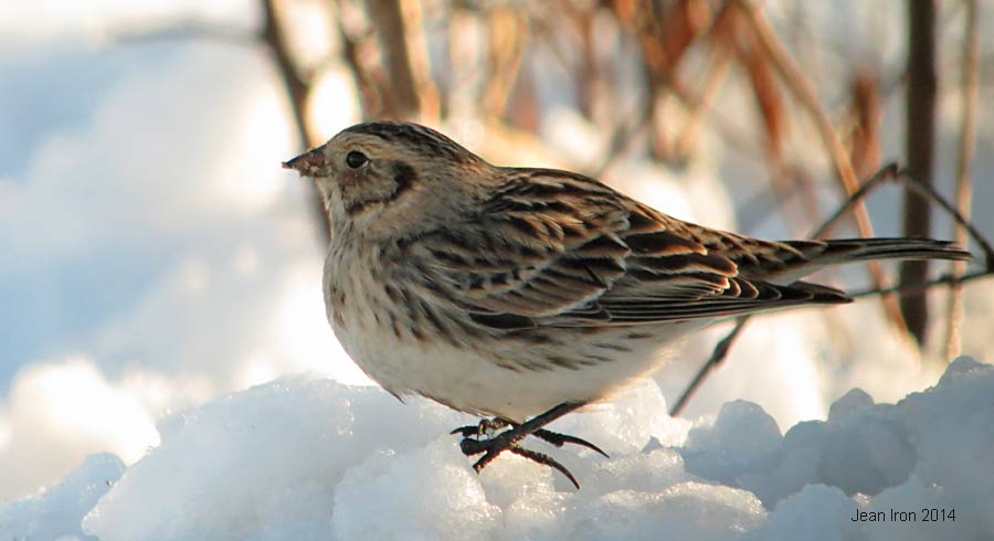 Lapland Longspur gets its name from the very long claw on the hind toe. Halls Road, near Cranberry Marsh in Whitby on 3 February 2014.