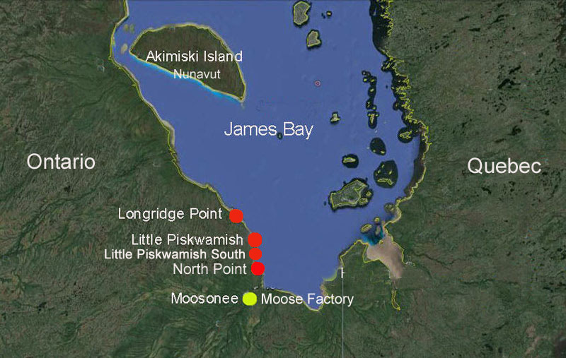 Piskwamish Point South and North Point. From the town of Moosonee,