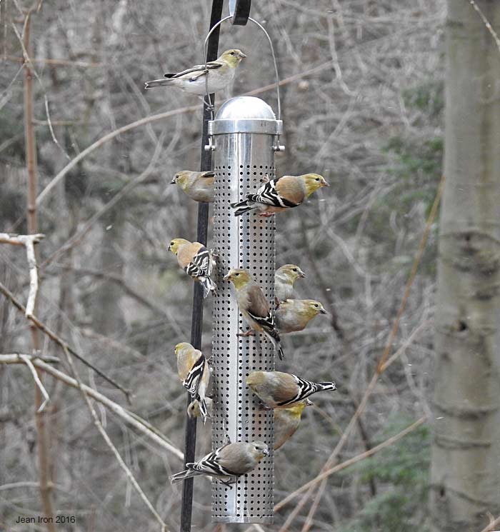 We've had about 100 American Goldfinches coming to the feeders daily since December. 5 February 2016.