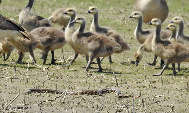 From the viewing shelter we watched an Eastern Fox Snake glide through the water at the Shorebird Cell where it encountered three Dunlin. Then on land it met up with Canada Geese and goslings. 18 May 2016