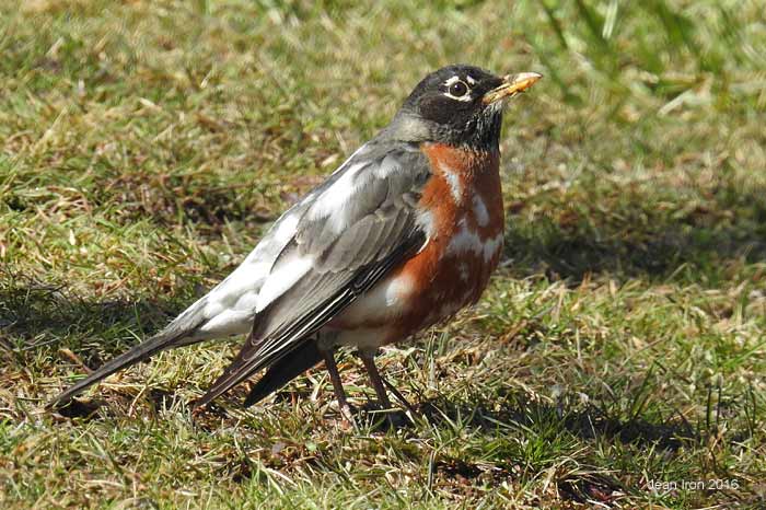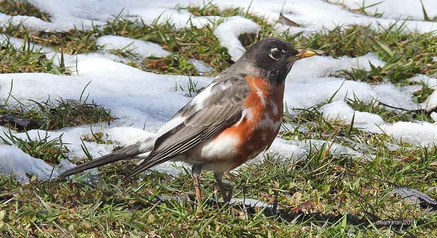 This Leucistic American Robin was in a flock feeding on a lawn in Brookbanks Park on 5 April 2016. Its coloration provided great camouflage between the melting snow and grass.