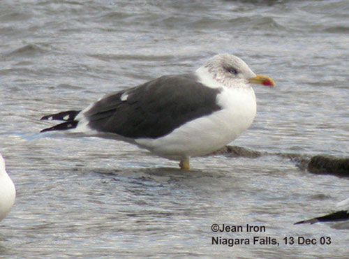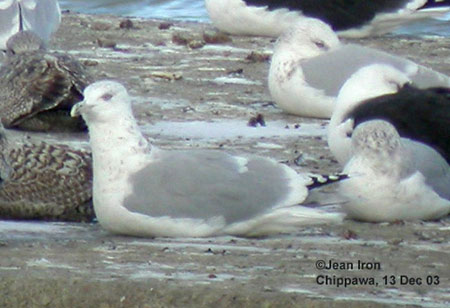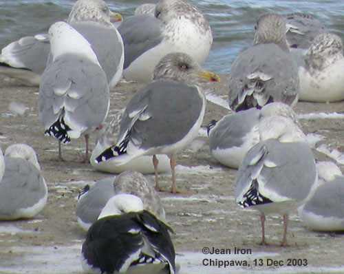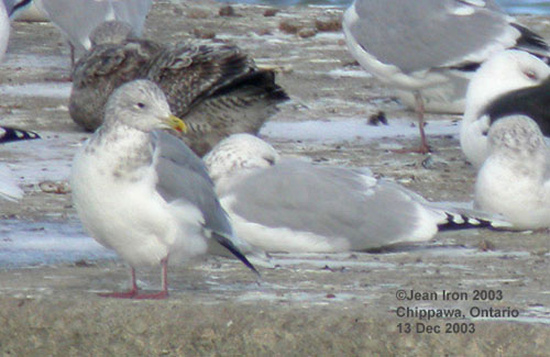 Photo 4. Probable Nelson's Gull (Glaucous x Herring hybrid) in definitive basic plumage at Chippawa, Niagara, Ontario, on 13 December 2003. Note larger size and paler mantle than Herring Gull with less black and more white in primaries.