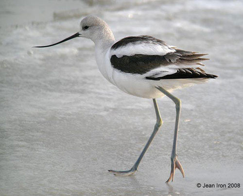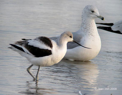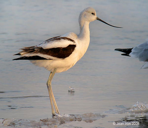 American Avocet in first basic plumage at Duffins Creek, Ajax, Ontario, 23 November 2008. Its worn brownish juvenal tertials indicate first year.