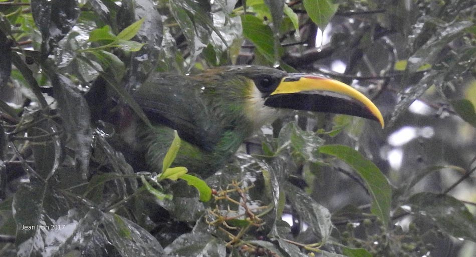 Emerald Toucanets continued eating fruit as the rain poured down. Please click on photo for video of toucan eating fruit.