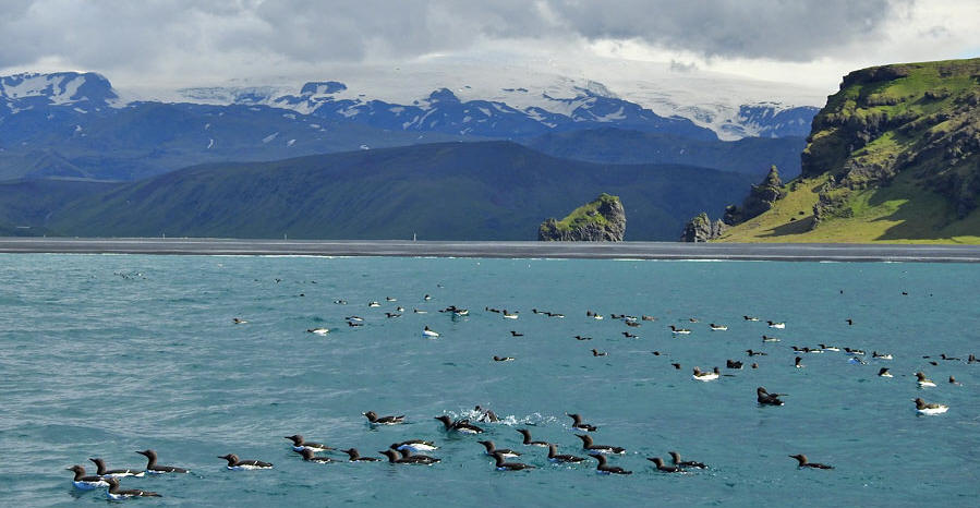 Murres at Dyrholaey with Myrdalsjokul glacier in the