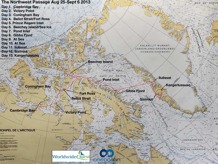 Cambridge Bay, Nunavut, north through Bellot Strait, east on